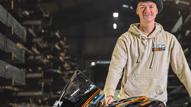 Storm Stacey reaches for the sky as he gets his hands on the all-new Ducati V4 R with Bathams AJN Racing