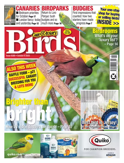 Our birds live in a brighter world - literally, they can see more colours. In recent years more has been learned about birds’ UV vision, and this week we catch up with this fascinating subject. From ducks to hummingbirds, numerous birds receive extra information about the world from a part of the spectrum that’s hidden to us. Even a peacock’s tail looks twice as dazzling to a peahen than to you or me! We’ve lots on canaries, too: London fancies, Yorkshires and Fifes are all covered in depth. We meet two new budgerigar fans, fly to Jersey for a very special show, hear the latest from Loro Parque on Tenerife, and learn about birdroom ‘luxuries’. Plus all the regular news and Club News.