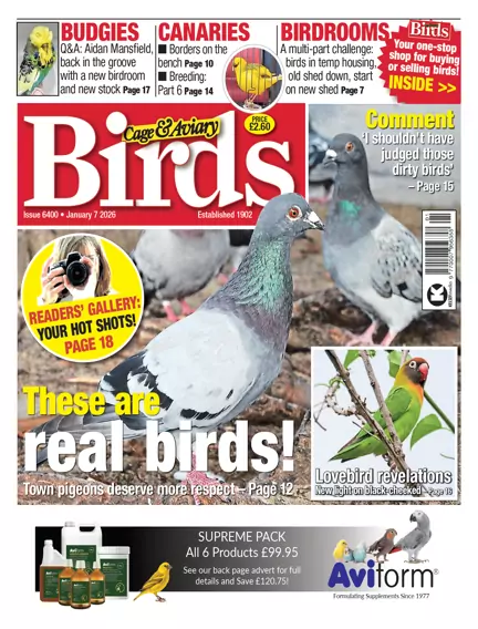 Feral pigeons: some people love them for being silly-tame, others despise them as “flying rats”. Properly understood, they are fascinating birds, which have lived alongside townsfolk for thousands of years. Just like fancy or racing pigeons, they come in many beautiful colours, and with a bit of insight their lives should be of interest to any birdkeeper. “Town pigeons” star on our cover this week! Elsewhere, we start 2026 strongly with canaries and focus on building a new shed, the Border fancy and an insight into successful breeding. We meet a fast-moving novice budgie man and a top zebra finch breeder from Spain. Plus we learn how not to do it (with ill-prepared show birds) and how to do it (with the amazing Avian Draw Christmas raffle results). Happy New Year!