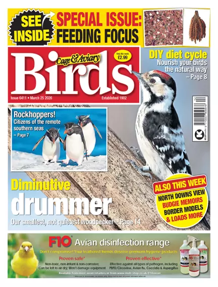 Breeding is about feeding, and at this time of year fanciers rely on stepped-up nutritional content to give their birds the boost they need - both the adults and youngsters. In a special bumper issue, we focus on a range of breeding-season diets from our regular expert contributors. Dave Brown provides an overview of how the breeding diet fits in to the whole annual cycle, modelling the pattern evolved by wild birds. Then detailed advice on their specialist breeds follows from Tony Edwards (Bengalese finches), David Allen (canaries), Mark Jones (native hardbills), budgies (Sam Wildes), small parrotlike (Les Rance) and mixed collections (David Urmston). Finally Dave Brown summarises his different softfood formats for foreign finches on the one hand and canaries on the other. And on other topics we meet the cute little lesser spotted woodpecker and the larger but still cute rockhopper penguin – all alongside our news and Club News regulars.