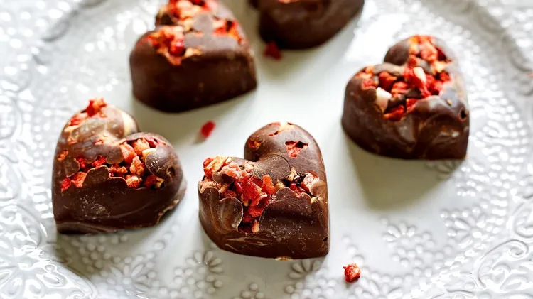 MAKES 15 (You will need a silicone mould with 15 heart-shaped cups) Ingredients 2g freeze-dried raspberries 150g milk or dark chocolate (depending on taste) A couple of drops of rose water 1. Add a pi