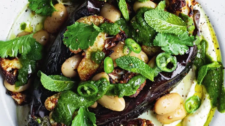 By Mob Serves 2 | Prep 10 mins | Cook 30 mins FOR THE AUBERGINES ½ a head of cauliflowerOlive oil1 tsp garam masala2 aubergines1 tbsp lime pickle150g plain vegan yoghurtJuice of ½ a lemon200g cannelli