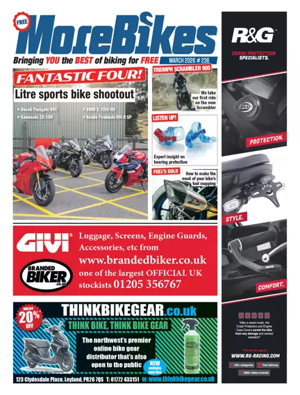 MoreBikes March 2026 brings a packed issue featuring the latest Triumph Scrambler 900 first ride, a litre sports bike shootout with Ducati, Honda, BMW and Kawasaki, trail‑riding skills, crucial hearing‑protection advice, fuelling‑tech guidance, top new products, and a scenic Bucks & Herts day‑ride route. Plus reader bikes, kit‑care tips, news and upcoming events.