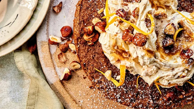 Torta di castagne, cioccolato e nocciole SERVES 6-8 Ingredients 250g cooked chestnuts150ml full-fat milk75g dark chocolate (70% cocoa solids),roughly chopped50g hazelnuts, toasted and chopped60g unsal