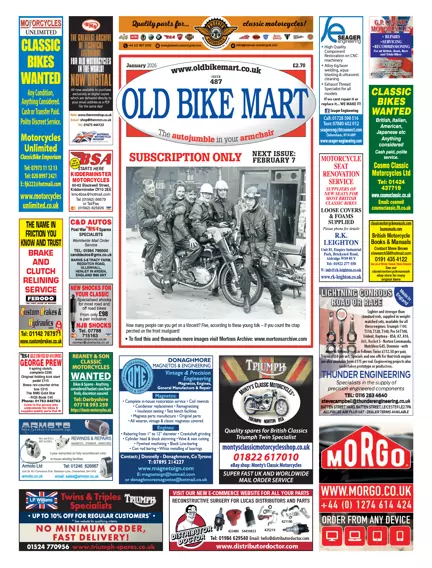 January’s Old Bike Mart brings classic motorcycling to life with news of Phelon & Moore’s revival, Sammy Miller’s lifetime awards, and major auction updates. Enjoy features on drag racing legends, touring tales, rare three-wheelers, and event highlights like the Classic Motorcycle Mechanics Show. Packed with club info, restoration tips, and parts ads, this issue is a must-read for enthusiasts.