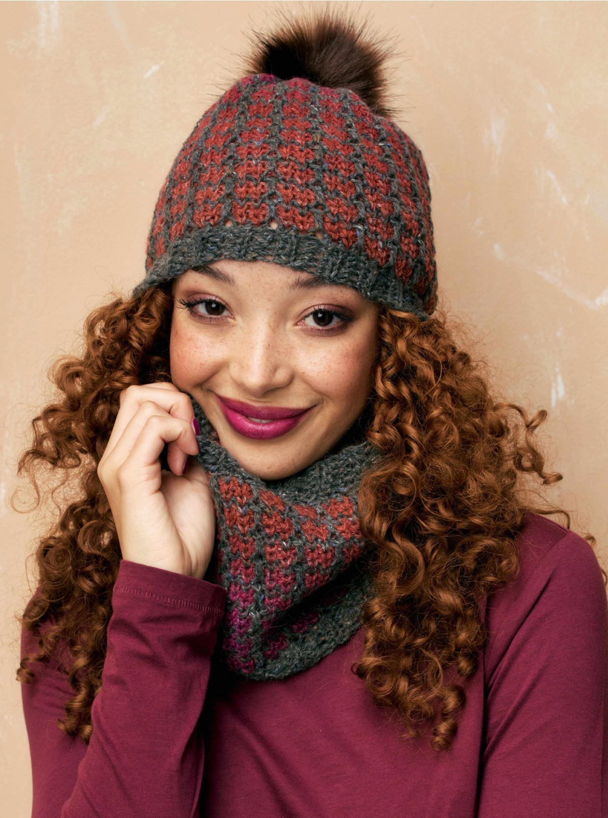 “THIS HAT and matching fingerless mittens are knitted in the round using Jamieson & Smith’s 2ply Jumper Weight Shetland wool,” explains Outi Kater. “The brim of the hat and the cuffs of the mittens ar