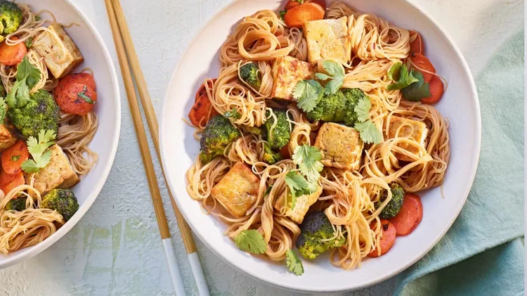 SERVES 4 PREP 10 mins COOK 25 mins EASY V 50ml low-salt soy sauce½ tbsp sesame oil2 tsp agave syrup½-1 tsp chilli flakes1 tsp cornflour280g firm tofu, cut into cubes1½ tbsp vegetable oil2 carrots, thi