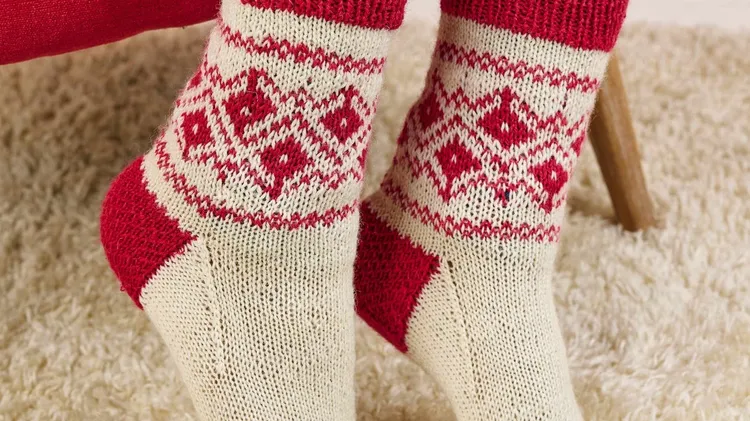 THESE SWEET socks have a stylised floral pattern knitted in a bright red shade on a cream background, bordered by narrow chequerboard bands; the cuffs, heels and toes are also knitted in red. Bronagh
