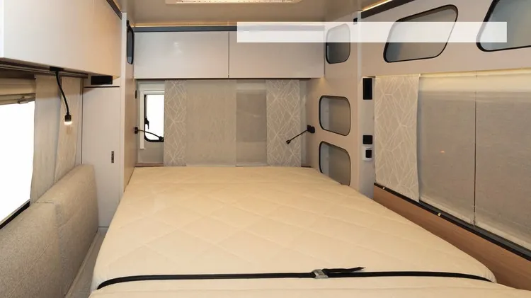 This is a caravan like no other, with an angular boxy shape and many surprises inside. It has a kitchen at the front – but that’s far from the only surprise. Taking full advantage of the boxy shape, t