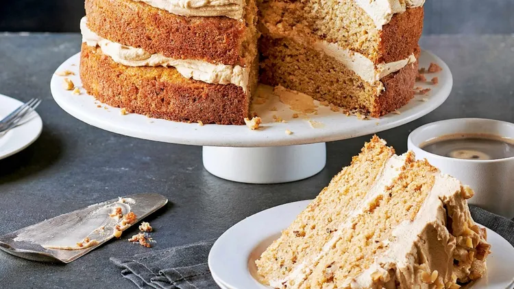 ■ Serves 8-10 ■ Prep 25 mins plus cooling ■ Cook 25 mins 250g unsalted butter, softened,plus extra for the tin2 tbsp instant coffee granules250g golden syrup4 eggs100g walnuts, finely chopped225g self